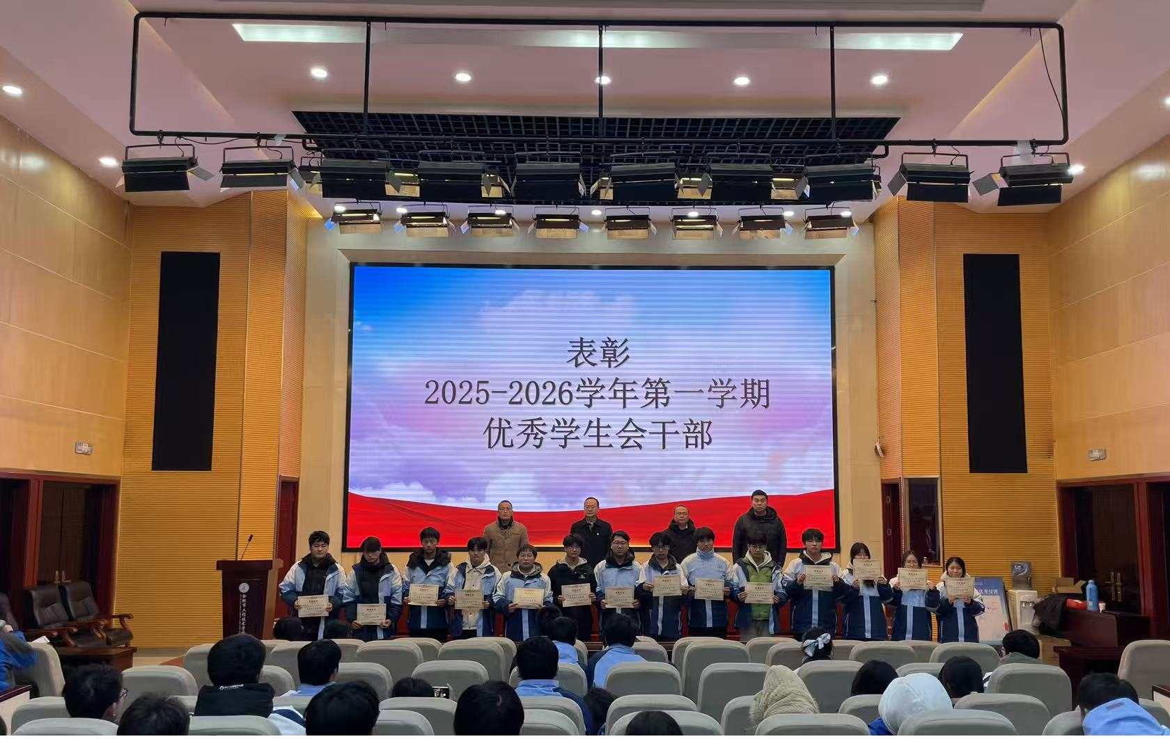 计票期间,感恩传承与优秀表彰环节温情上演。学校为离任的2023级学生会干部颁发任职证明,感谢他们的辛勤付出;同时表彰2025-2026学年第一学期优秀学生会干部,以榜样力量激励全体学子。