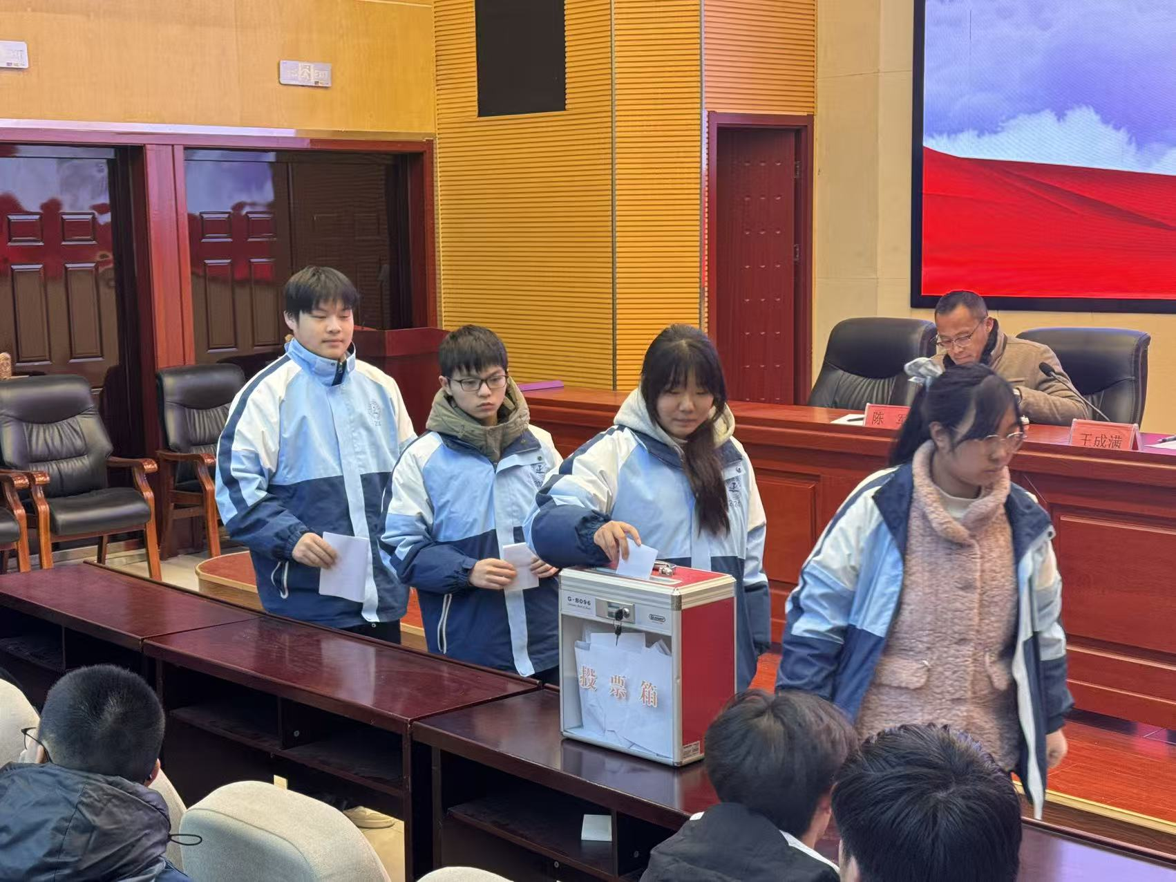 换届选举环节6名主席团候选人依次登台,在5分钟限时发言中,结合自身经历阐述工作设想,展现出扎实的能力与饱满的热情。大会采用差额选举方式,经代表们庄严投票,最终4名优秀学子脱颖而出,当选新一届学生会主席团成员。