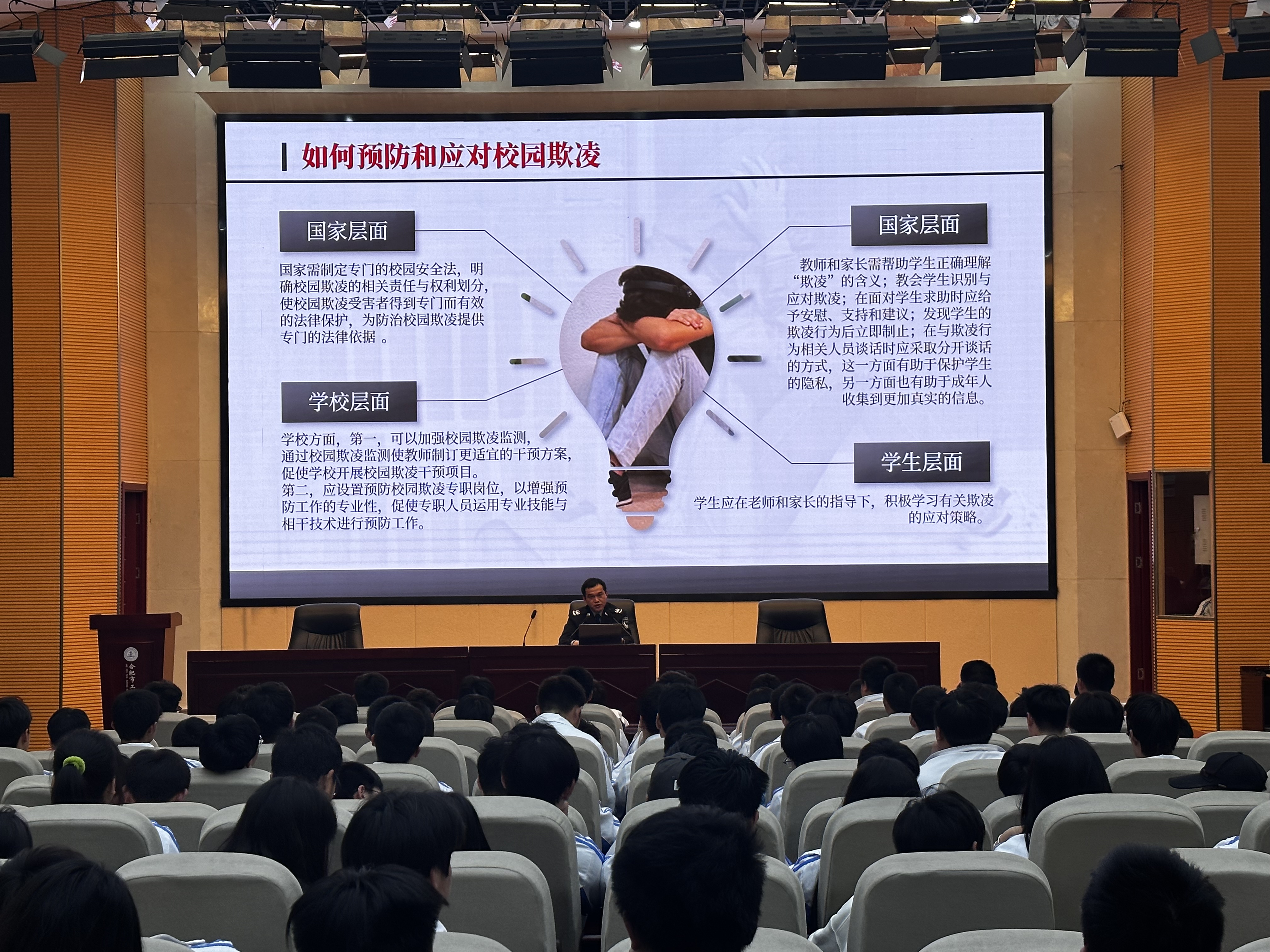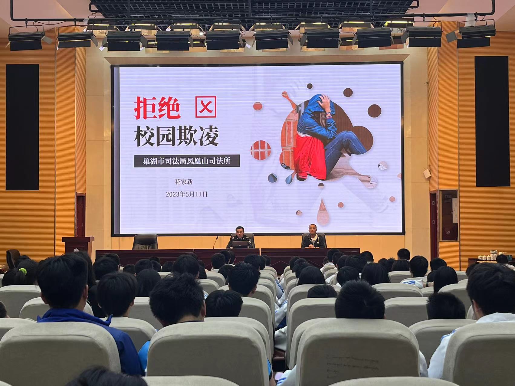 为贯彻落实《安徽省学校安全生产专项领导小组文件》(皖学安〔2023〕1 号、2 号、3 号)文件精神,进一步加强法治教育,预防校园欺凌,推动建设平安和谐稳定校园环境,5月11日下午,我校邀请凤凰山司法所所长花家新到校举行预防校园欺凌专题讲座,讲座由政教处副主任陈军主持。